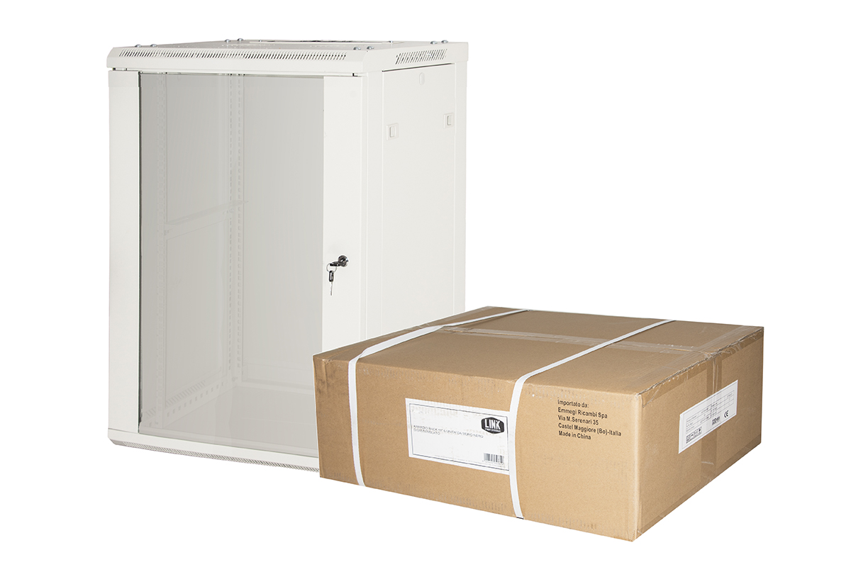 ARMADIO RACK 19″ 15 UNITA’ DA MURO (A) 770 x (L) 600 x (P) 450 GRIGIO DISASSEMBLATO PORTA VETRO