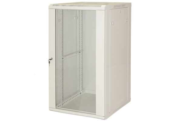 ARMADIO RACK 19″ 18 UNITA’ DA MURO (A)900 (L)600 X PROFONDITA’ 600 MM. COLORE GRIGIO CHIARO PORTA VETRO