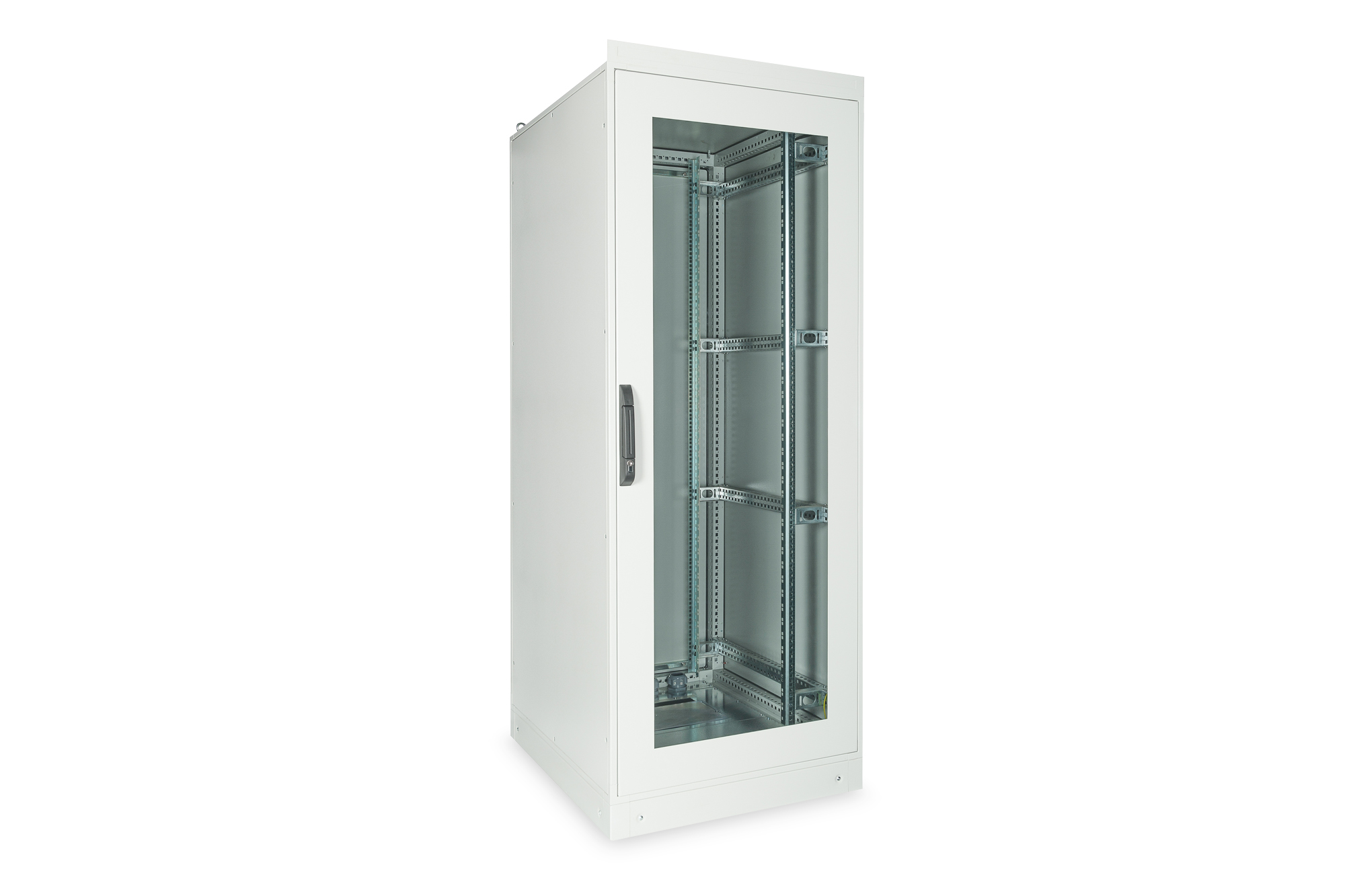Con porta in vetro temperato da 4 mm. in incastellatura di metallo. Ê incluso anche un basamento da 100 mm. per alloggiare cavi aggiuntivi.