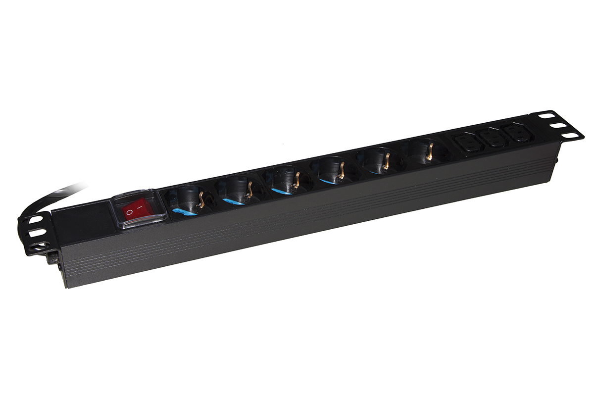 Con 6 prese universali Schuko tedesche e italiane tripolari UNEL 2P+T 16A femmina disposte a 35 gradi e 3 prese femmina C13. Per mette quindi di installare dispositivi con diverse esigenze di alimentazione.