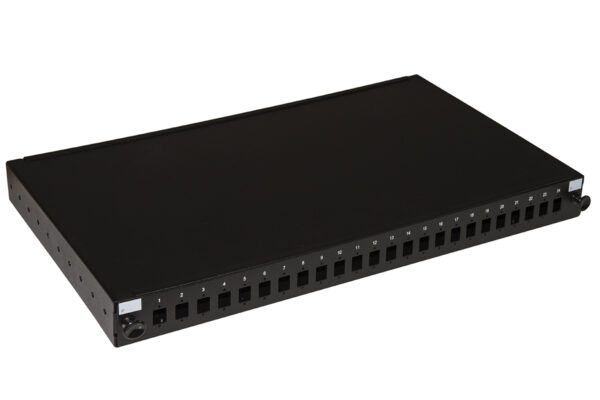 PANNELLO FIBRA OTTICA 19″ CON 24 PORTE SC SIMPLEX O LC DUPLEX PROFONDITA’ 250 MM NERO CON ACCESSORI