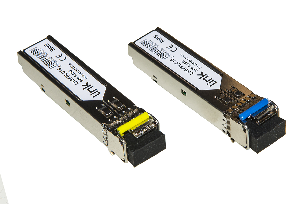 Moduli 1.25 Gbps SFP, Distanza fino a 20 Km, singlemode, connettore LC Simplex 1310nm e1550nm per trasmissione e ricezione dati.